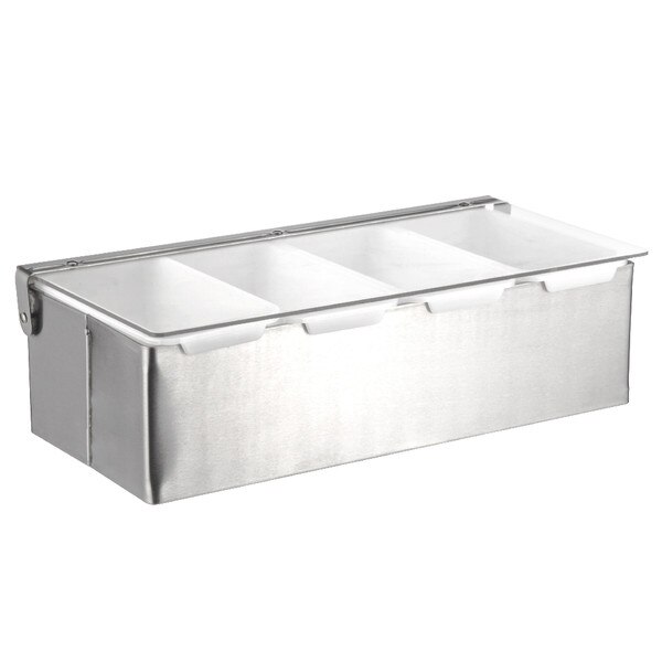 Hold everything from jalapenos to cherries conveniently with the Browne 79300 Condiment Caddy. The Browne 79300 Condiment Caddy has a stylish stainless steel holder with a plastic hinged cover and four 1 pint plastic inserts. The Browne 79300 Condiment Caddy is ideal for bar and buffet service.