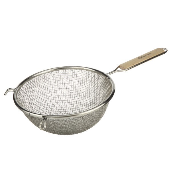 The Browne 8098 Strainer is very versatile with a variety of uses from dry to wet. With a 8 inch bowl this Browne 8098 Strainer has pan hooks with a flat bottom wood handle and reinforcing bands with double fine mesh for heavy duty use. A Browne 8098 Strainer will work well in all kitchens to handle pasta or flour with ease and perfection.
