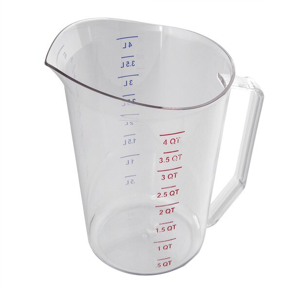 This 4 quart Camwear measuring cup 400MCCW135 from Cambro is made to withstand commercial use. Made of polycarbonate, the measuring cup will not break or dent and features a molded in handle that will not snap off or come apart. This measuring cup is clear for fast and easy measuring and the graduations are marked externally, molded in and imprinted in bright red and blue for quick and clear reading.