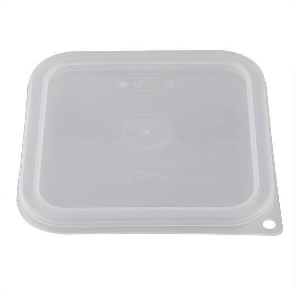 The SFC2SCPP CamSquare® Seal Cover is the ultimate addition for your 2 quart and 4 quart Camwear Camsquare® food storage containers. This translucent cover is constructed with an inner and outer seal, creating a highly spill-resistant fit that is snug and tight, resulting in a safer experience for employees who are transporting boxes from one place to the next. The SFC2SCPP can withstand temperatures from -40°F to 160°F and it features a small hole on the corner for convenient hanging during times of storage.