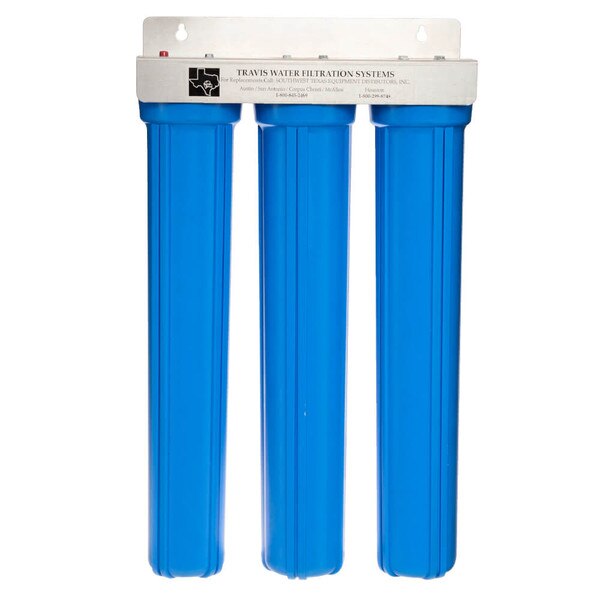 Tri Filter Assembly, 20 inch, blue reinforced polypropylene, with brushed aluminum mounting bracket, includes (1) 20-155014-44 coarse filter cartridge to remove sediment, (1) 20-155100-43 phosphate crystal filter cartridge for limescale/calcium reduction, and (1) 20-155529-43 carbon block cartridge to improve taste/odor, recommended for machines from 1000 to 2500 lbs.
