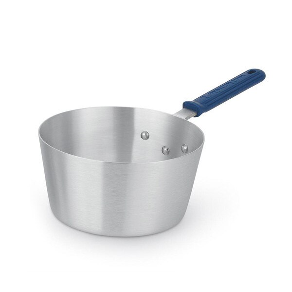 The Vollrath 4350 Wear-Ever 10 Quart Aluminum Sauce Pan features a natural finish ideal for cooking with oil and grease. Its silicone-insulated, removable Cool Handle provides protection and comfort. Wear-Ever tapered sauce pans have Vollrath's exclusive EverTite Riveting System for a lifetime of secure, tight rivets on its steel handle. Use this 4350 Wear-Ever Aluminum Saute Pan for years of perfect sauteing.