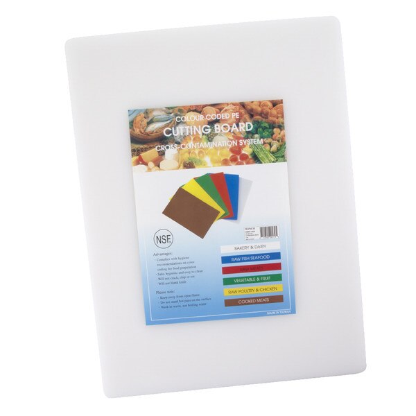 This CBWT-1520 Winco cutting board is made of white plastic. The cutting board is a 15" x 20" rectangle and is 1/2" thick.