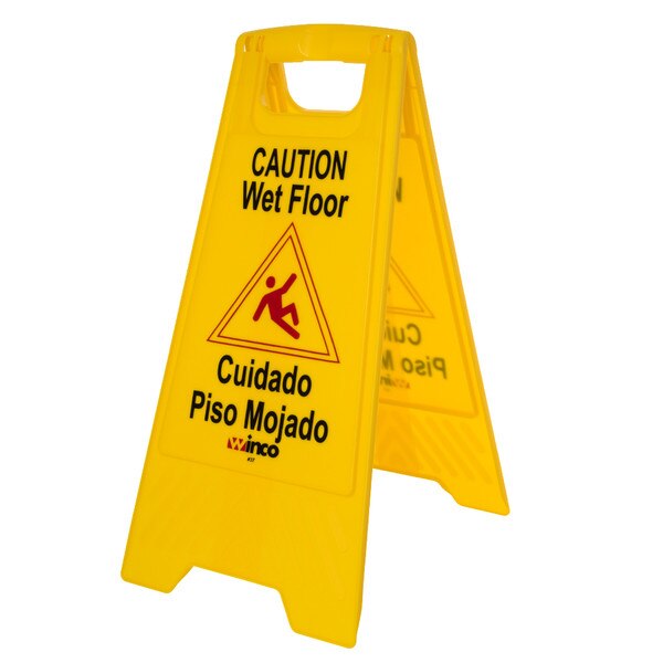 Alert people of possible dangers due to a slick spot on the floor left from spills or recently moped areas with this Winco WCS-25 Wet Floor Sign. Bilingual in Spanish and English this Winco WCS-25 Wet Floor Sign is lightweight with bright yellow coloring and is two sided to fold for any cart. Winco WCS-25 Wet Floor Sign is ideal for use anywhere that guest safety is important and a great way to prevent accidents.